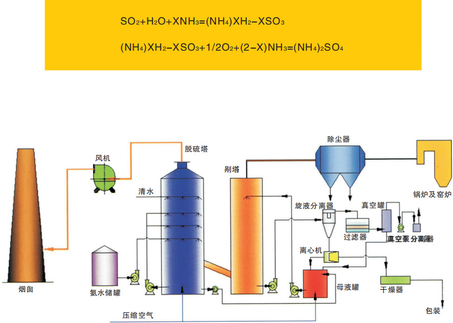 吸收系統(tǒng):吸收形成的亞硫酸銨氧化成硫酸銨,硫酸銨溶液將煙氣溫度降低并蒸發(fā)水分,自身濃度得到了進(jìn)一步提高。