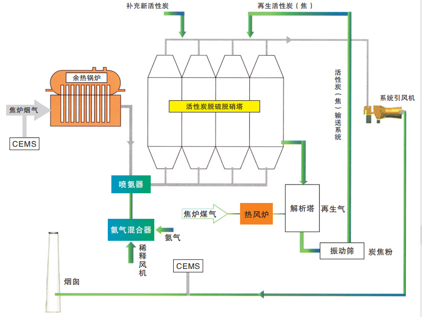 煙氣在系統(tǒng)風(fēng)機(jī)的作用下先進(jìn)行余熱回收器,后進(jìn)入活性炭(焦)脫硫脫硝一體化裝置再經(jīng)過(guò)風(fēng)機(jī)送回焦?fàn)t煙囪實(shí)現(xiàn)達(dá)標(biāo)排放。