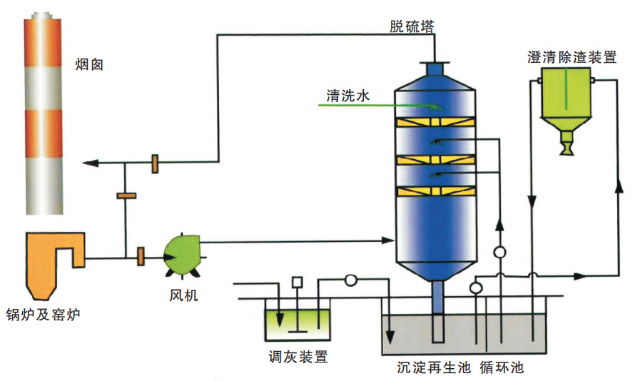 鈉——鈣雙堿法的原理是用堿金屬鹽(NaOH、Na2CO3、NaHCO3等)的水溶液在脫硫塔內(nèi)與煙氣中的SO2充分接觸反應(yīng)生成亞硫酸鈉(Na2CO3)或亞硫酸氯鈉(NaHCO3)吸收后的脫硫液進(jìn)入再生反應(yīng)中用石灰漿液再生出NaOH,再生漿液經(jīng)液固分離后,含NaOH、Na2CO3的濾液進(jìn)入脫硫塔循環(huán)脫硫;濾渣(亞硫酸鈣、少量硫酸鈣)可拋棄,也可加工為石膏回收利用。